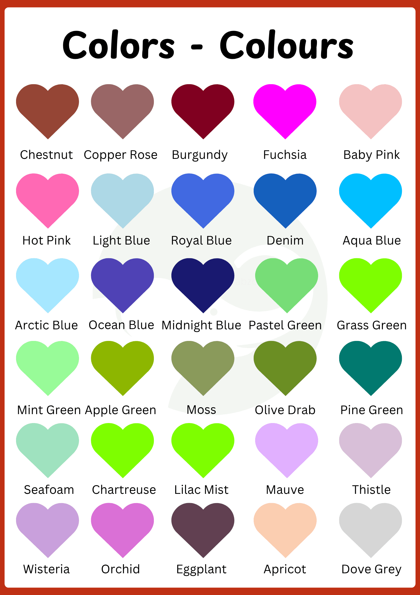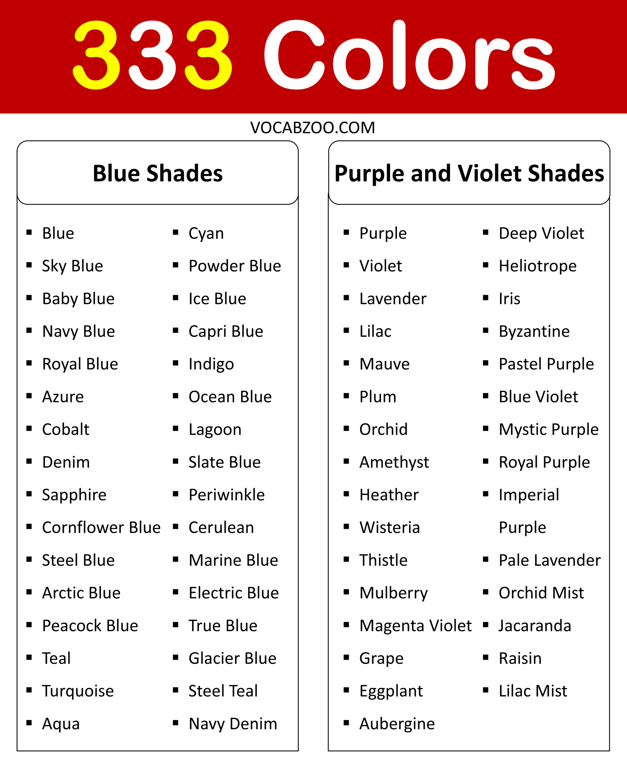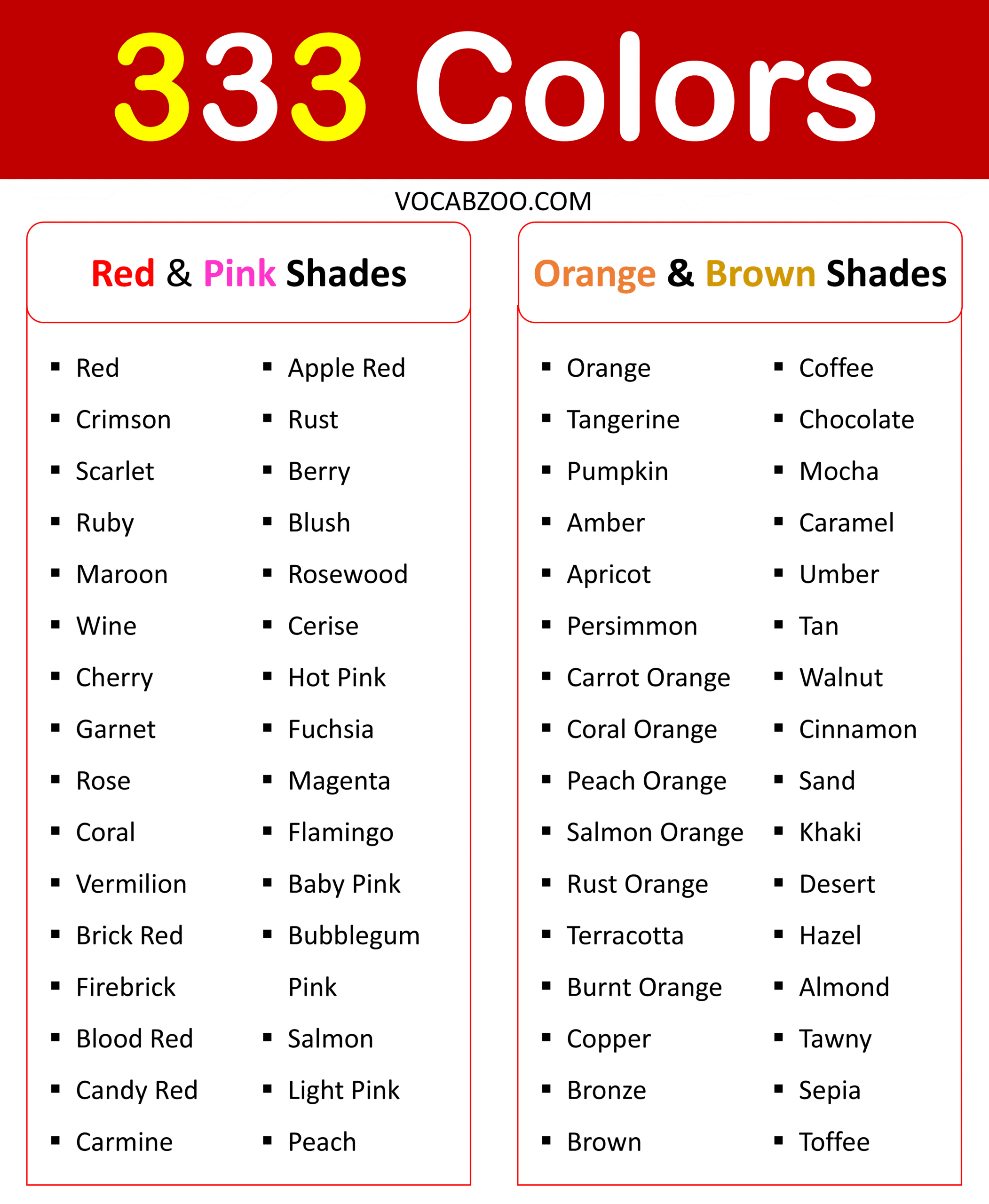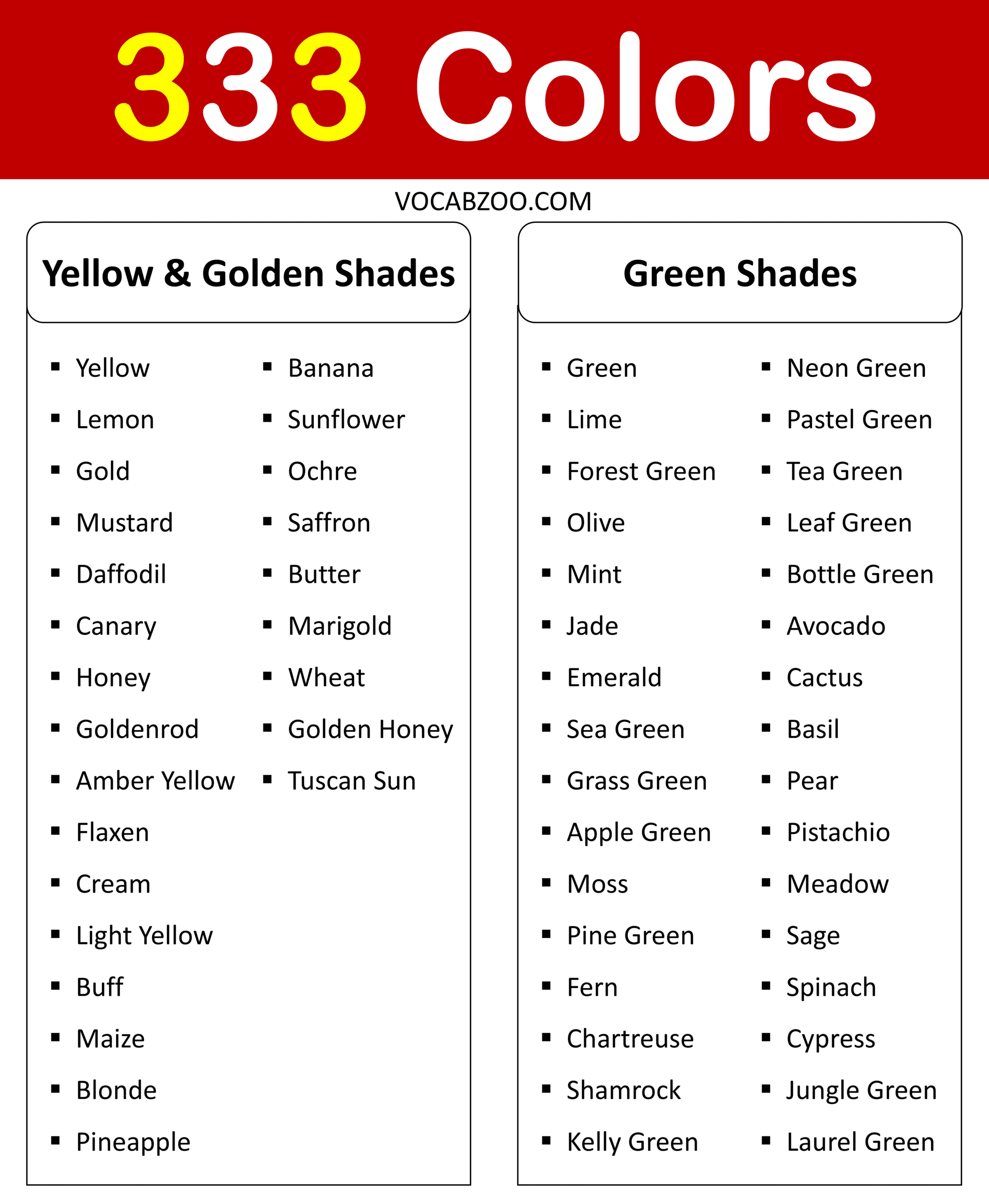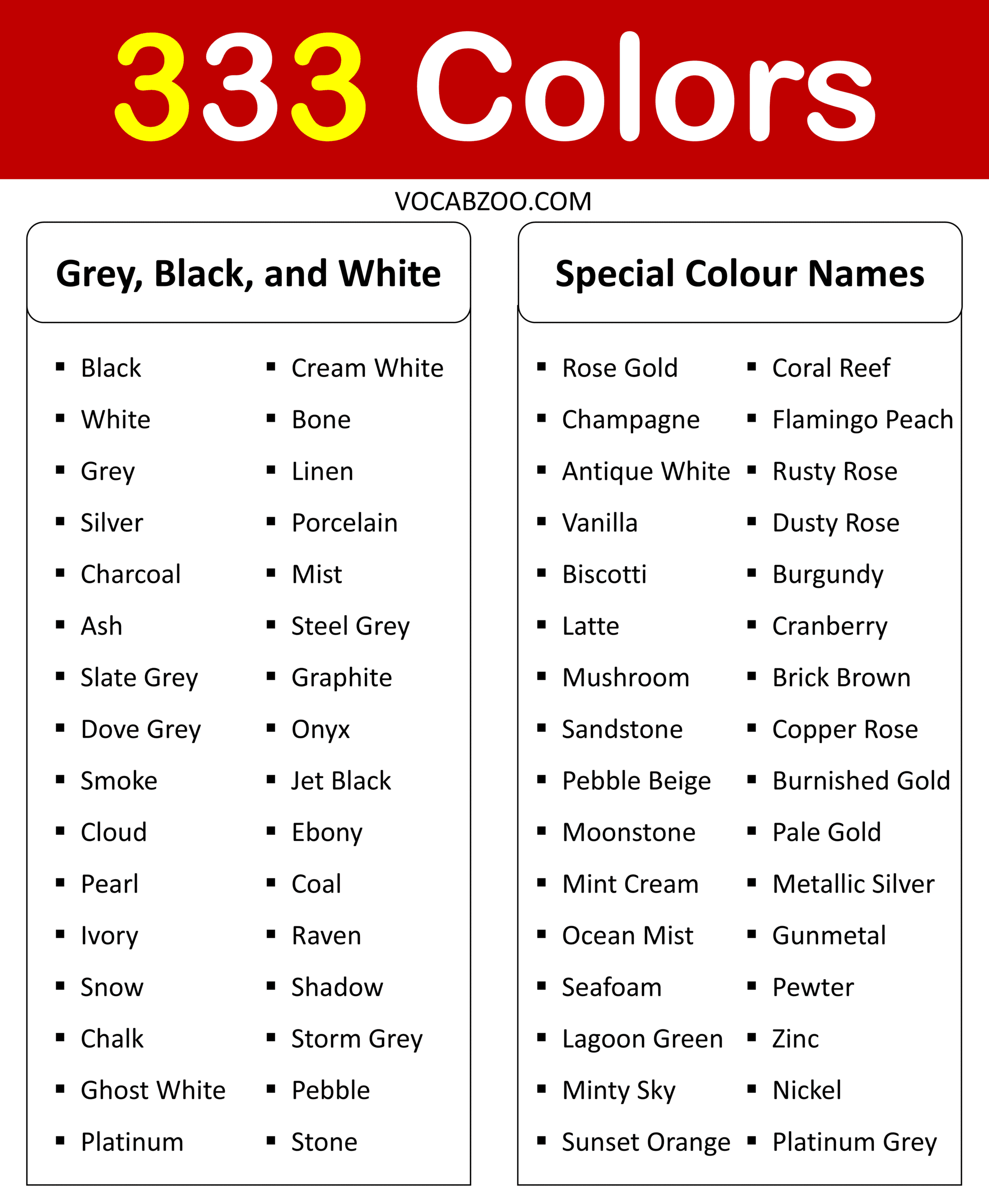 Have you ever wondered how many colour names there are in English? Colours make our world beautiful, help us express emotions, and describe things better. In this article, you’ll learn 333 colour names in English with meanings, color pictures, and HEX codes — all in simple and easy words. Whether you’re learning English for school, design, or daily use, this list will help you understand and use colour words naturally.