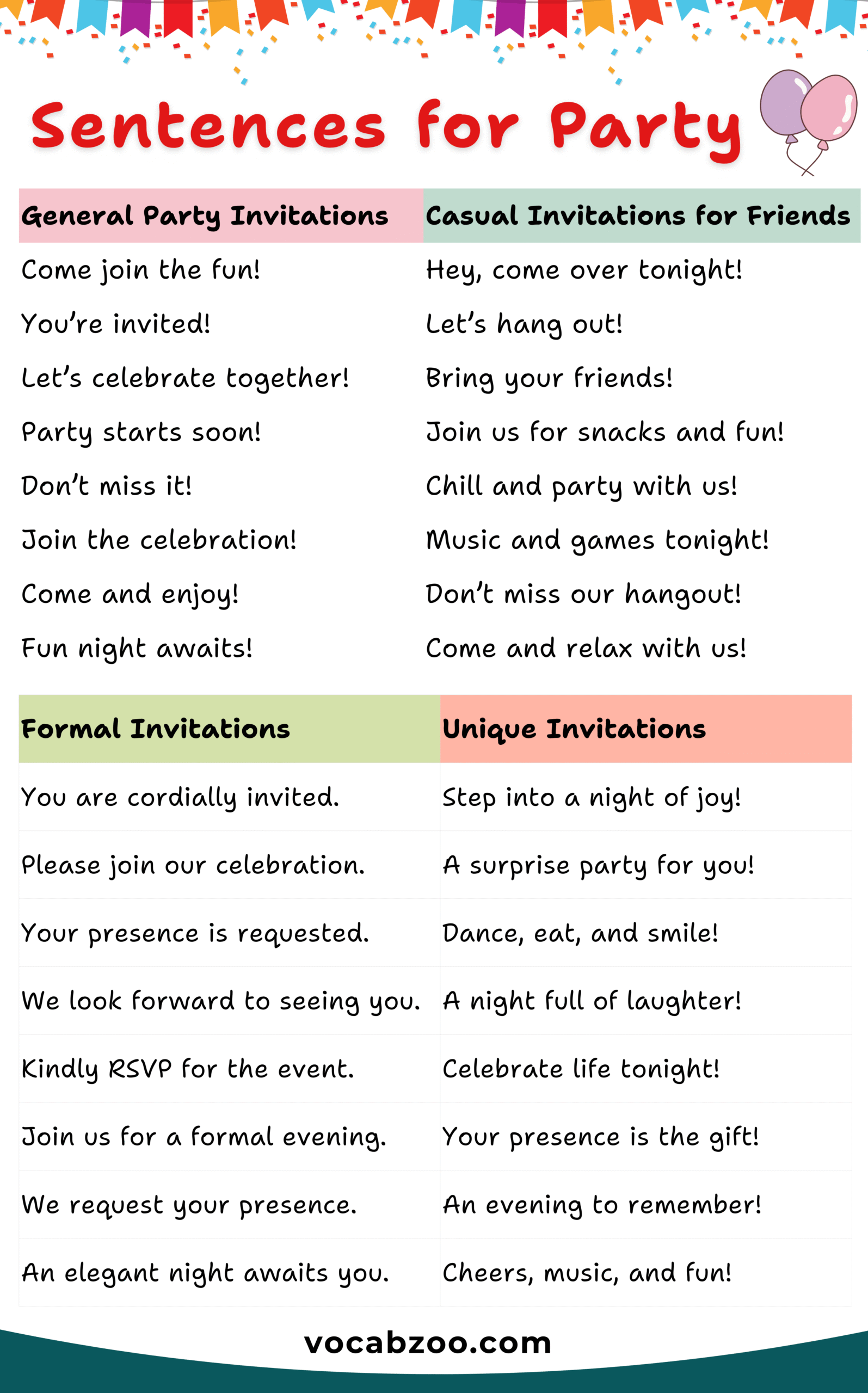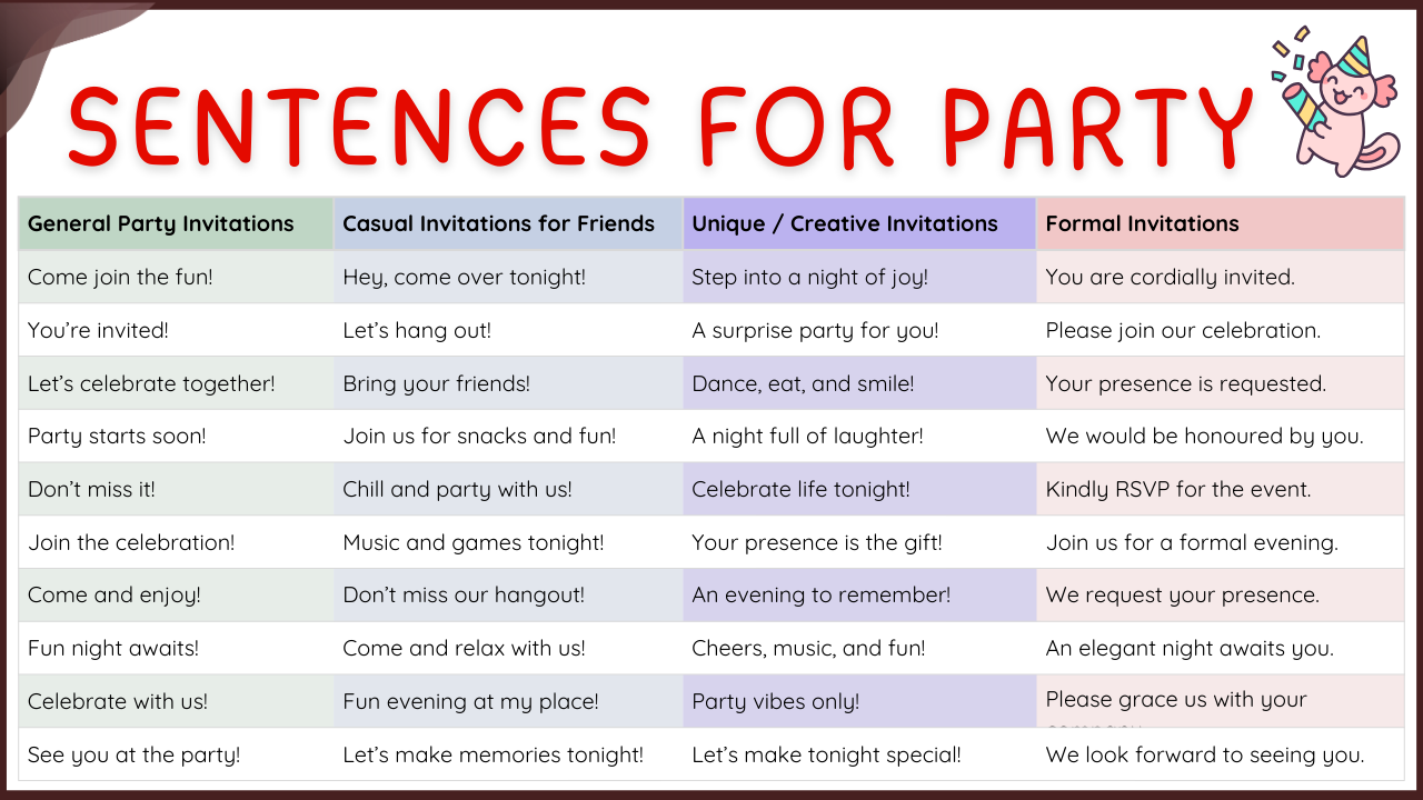 Party invitation sentences are simple words or phrases used to ask someone to join a party. They can be formal or casual depending on the situation. Using clear words makes it easy for your friends or guests to understand the party details.