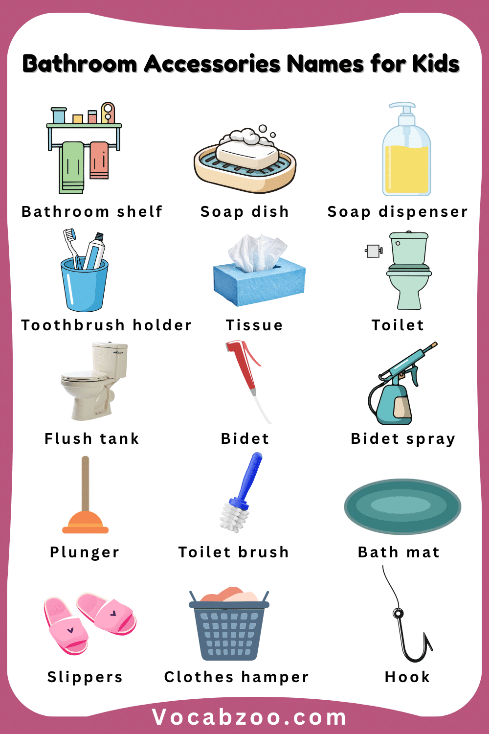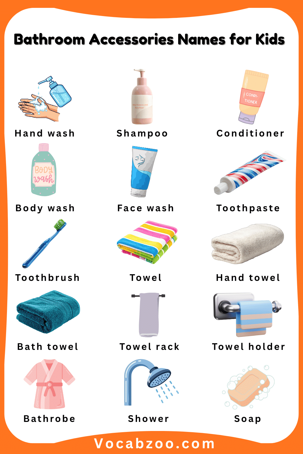 Bathroom accessories are everyday items that we use to keep ourselves clean, fresh, and organized in the bathroom. These include things like a toothbrush, soap, towel, shampoo, and comb, which are important for daily hygiene and care. Learning bathroom accessories names in English helps kids recognize common items they use every day and improves their basic vocabulary. In this article, children will learn bathroom accessories with their names and pictures, making it easier to identify each item and understand how they are used in daily life.