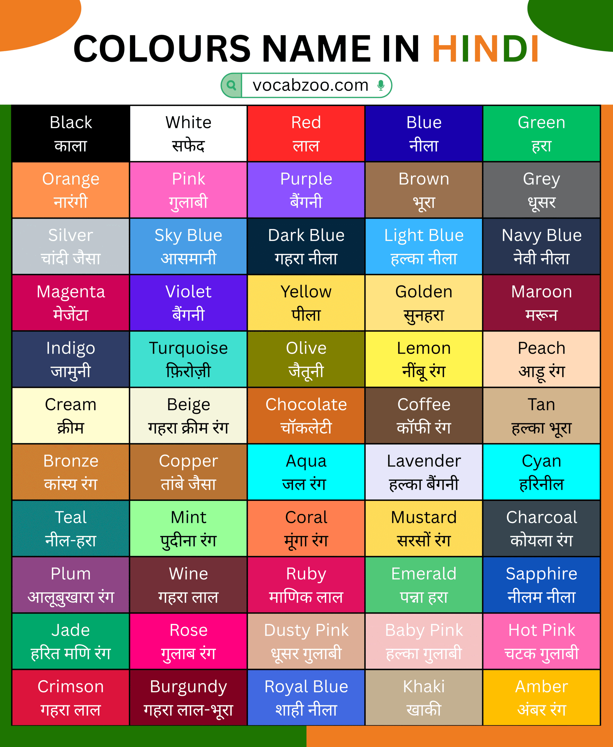 Below is a table showing the most commonly used colour names with their Hindi translations and English meanings.