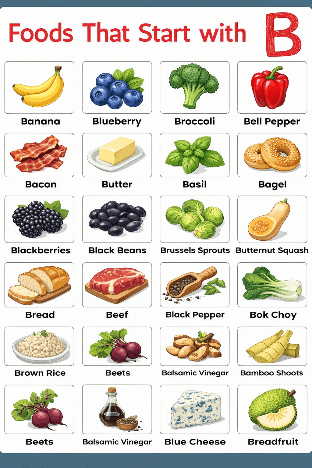 Learning the names of foods is helpful for talking about meals, recipes, and shopping in English. In this blog post, you will discover 80+ Names of Foods That Start with B in English with pictures to help you recognize and remember each item easily. These food words are part of everyday vocabulary that you can use in conversations, cooking, and reading. When you know their correct names, your speaking becomes more confident, your writing improves, and your listening skills get stronger. Keep reading to explore a variety of foods and expand your vocabulary step by step.