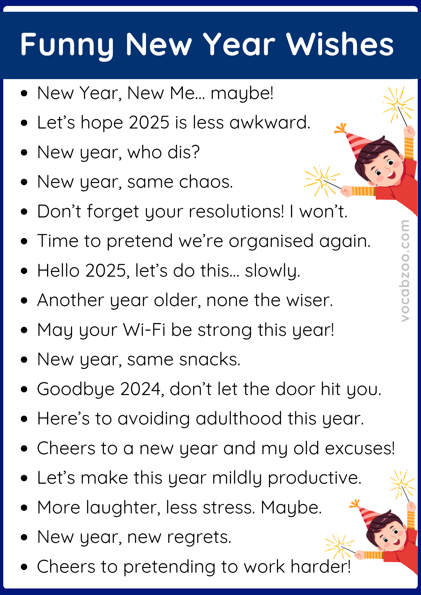 Funny New Year greetings are a fun and easy way to wish others. They make your wishes memorable and full of joy. You can use them with friends, family, or classmates. Simple, creative, and cheerful greetings can spread happiness and start the year with a smile.