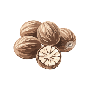 Nutmeg is a warm, aromatic spice made from seed of a tropical tree. It is used in baking, desserts, and savory dishes.
