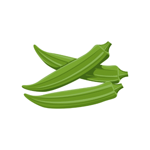 Okra is a green vegetable with a long shape and soft seeds inside. It is used in cooking and becomes slightly sticky when cooked.