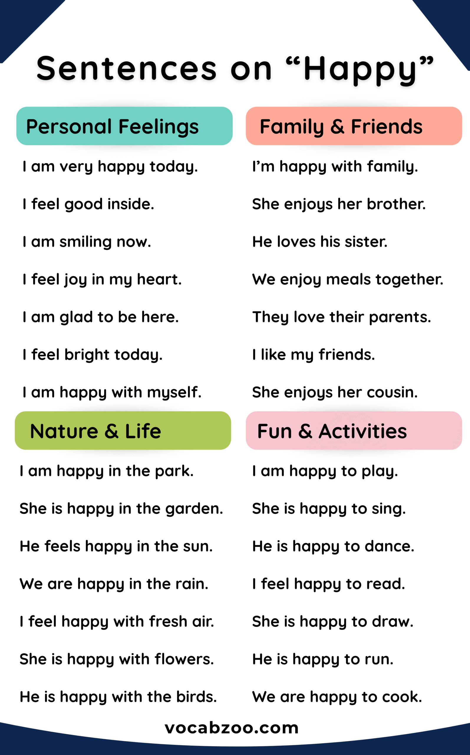Happiness is a part of daily life, and we often use English sentences to share our happy feelings. In this lesson, you will learn 50+ simple and useful happy English sentences that you can use in school, with friends, or in daily conversations. By practicing these sentences, you can easily express your happiness in English with confidence.