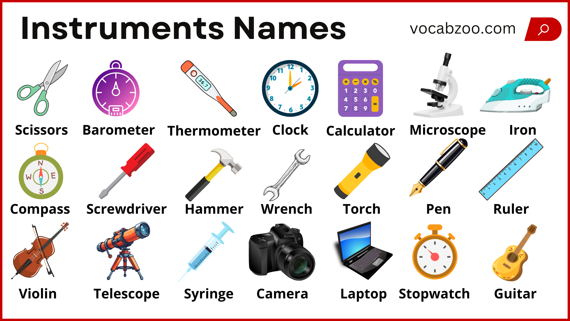 In this blog post, you will learn the most useful instruments names in English with their pictures that we use in our daily life. Instruments are tools or devices that help us measure, create, or repair things. Learning their names and meanings will help you improve your English vocabulary and understand conversations better.