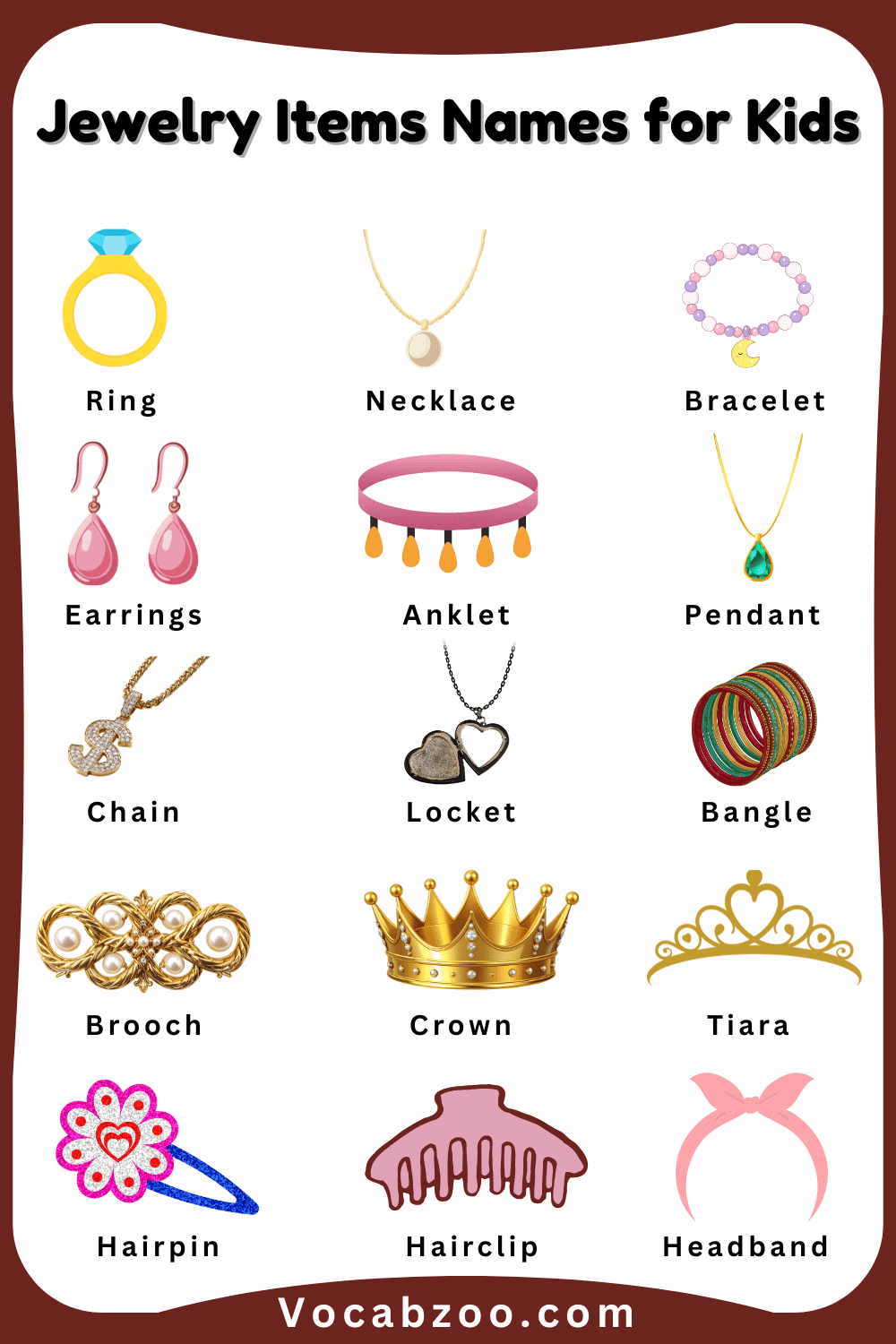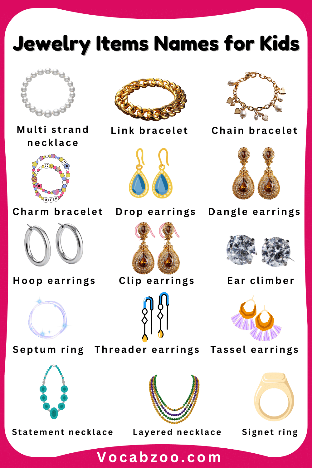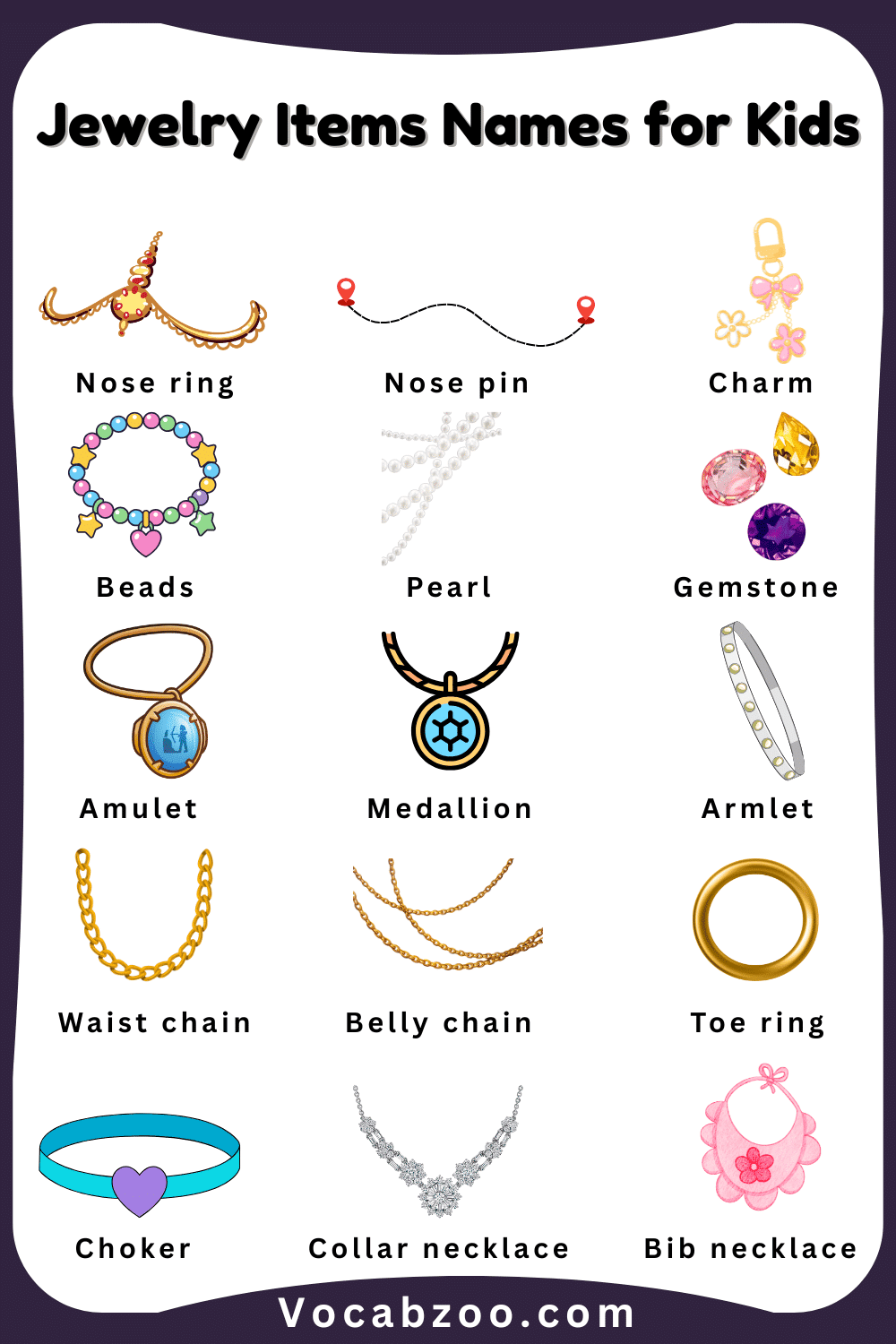 Jewelry is something many people wear to look pretty and special, and it comes in many beautiful forms. In this post, kids will learn the names of common jewelry items in English with the help of clear and colorful pictures. From rings and necklaces to bracelets and earrings, each item is easy to recognize and fun to learn. This simple guide uses easy words so children can quickly understand, remember, and use these names in their daily life while enjoying the learning process.