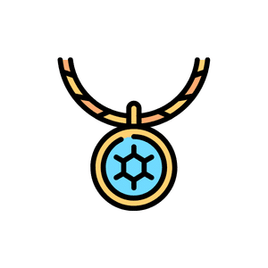 A medallion is a large, round piece of jewelry worn on a chain. It often has designs, pictures, or symbols and is used for decoration or meaning.
