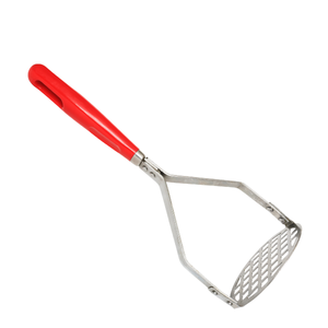A masher is a kitchen tool with a flat or patterned base used to crush soft foods like potatoes or bananas into a smooth mixture.