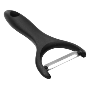 A peeler is a small tool with a sharp blade used to remove the thin outer skin of fruits and vegetables such as potatoes, carrots, or apples.