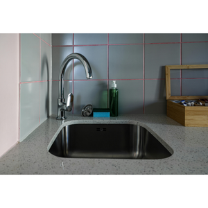 A soap dispenser is a small container that releases liquid soap when pressed. It is used for washing hands or dishes near the sink.