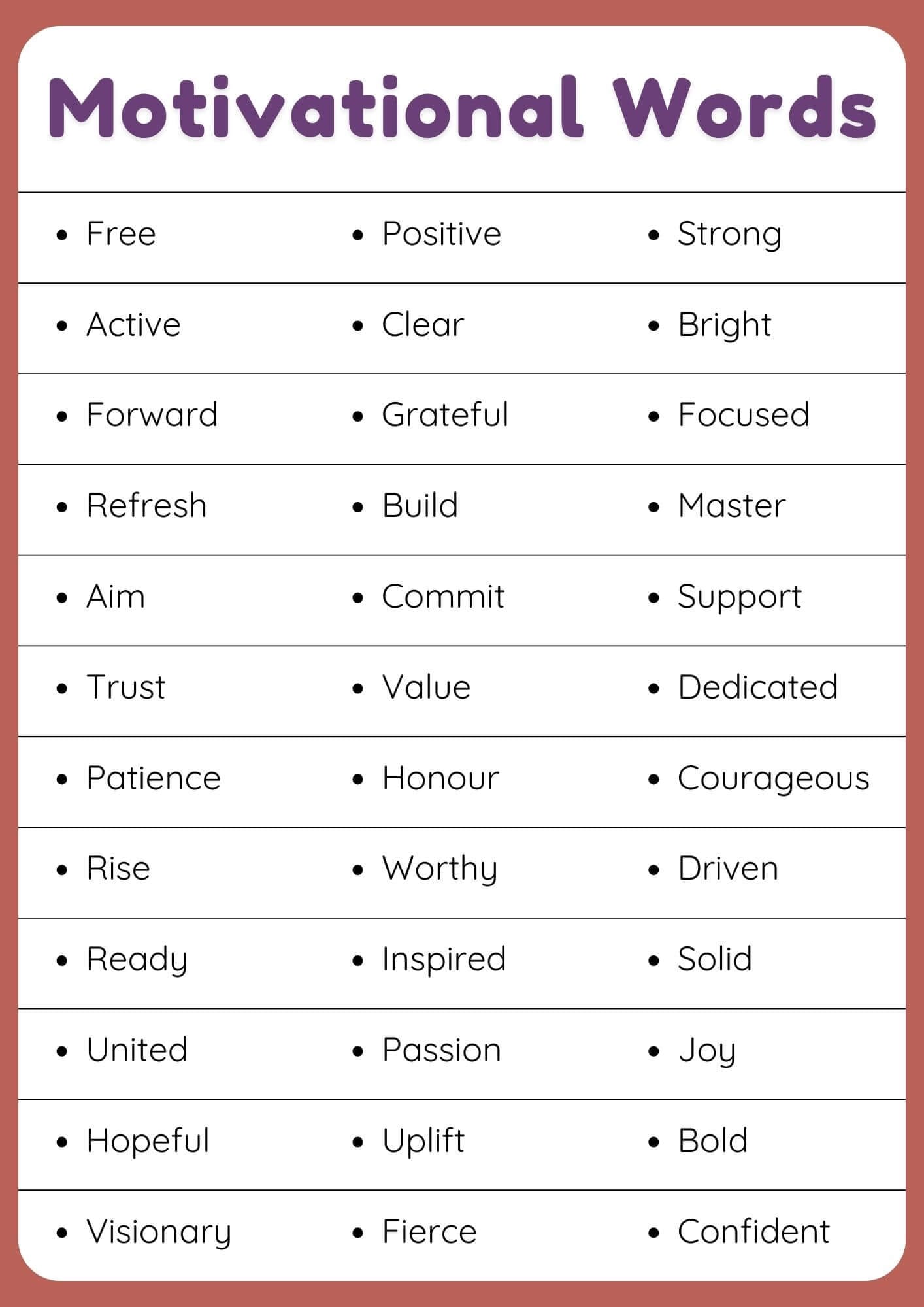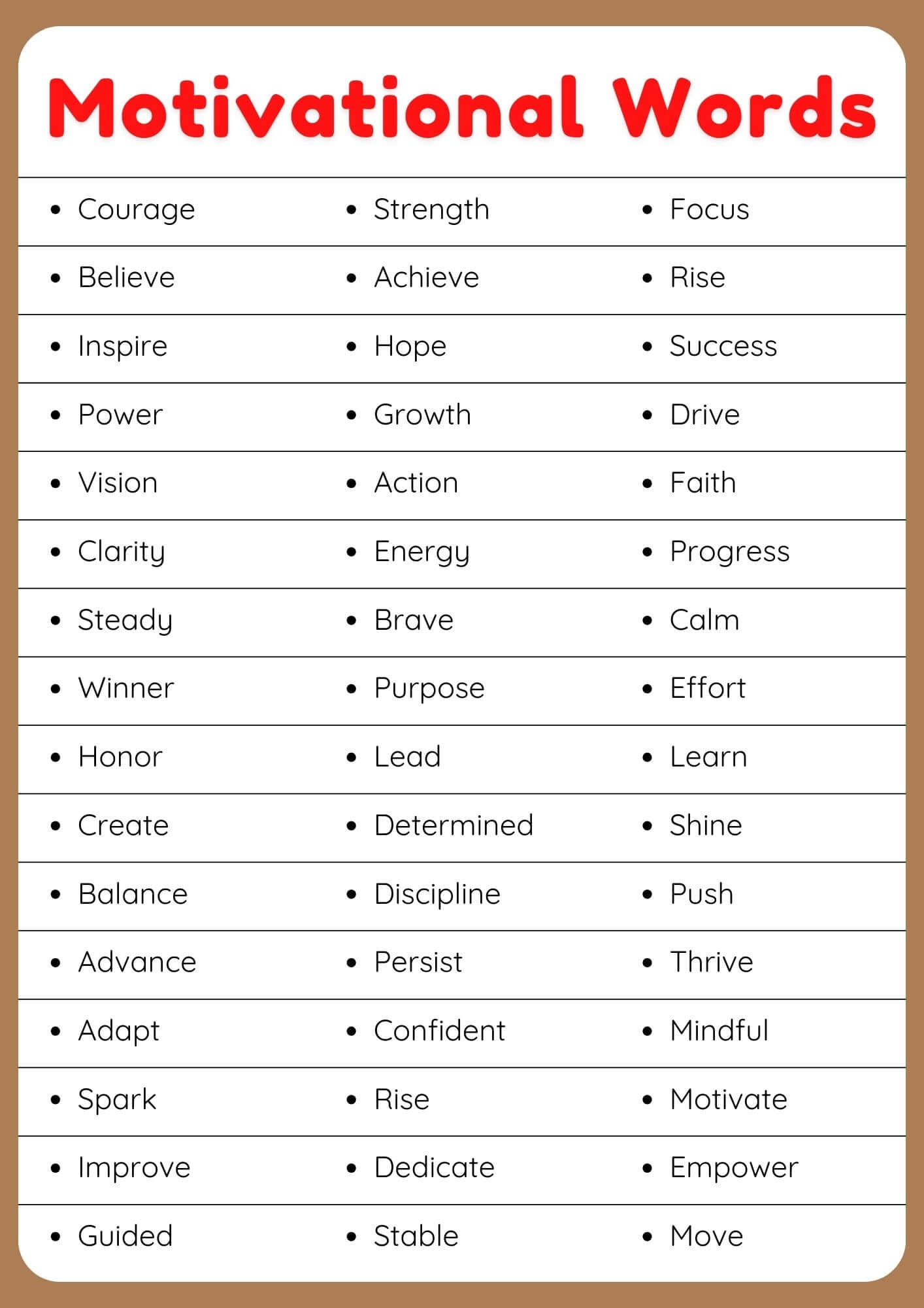 Good motivational words are positive and inspiring words that boost confidence, focus, and action. They help you stay strong, hopeful, and determined during challenges. Examples include courage, focus, hope, thrive, and success.