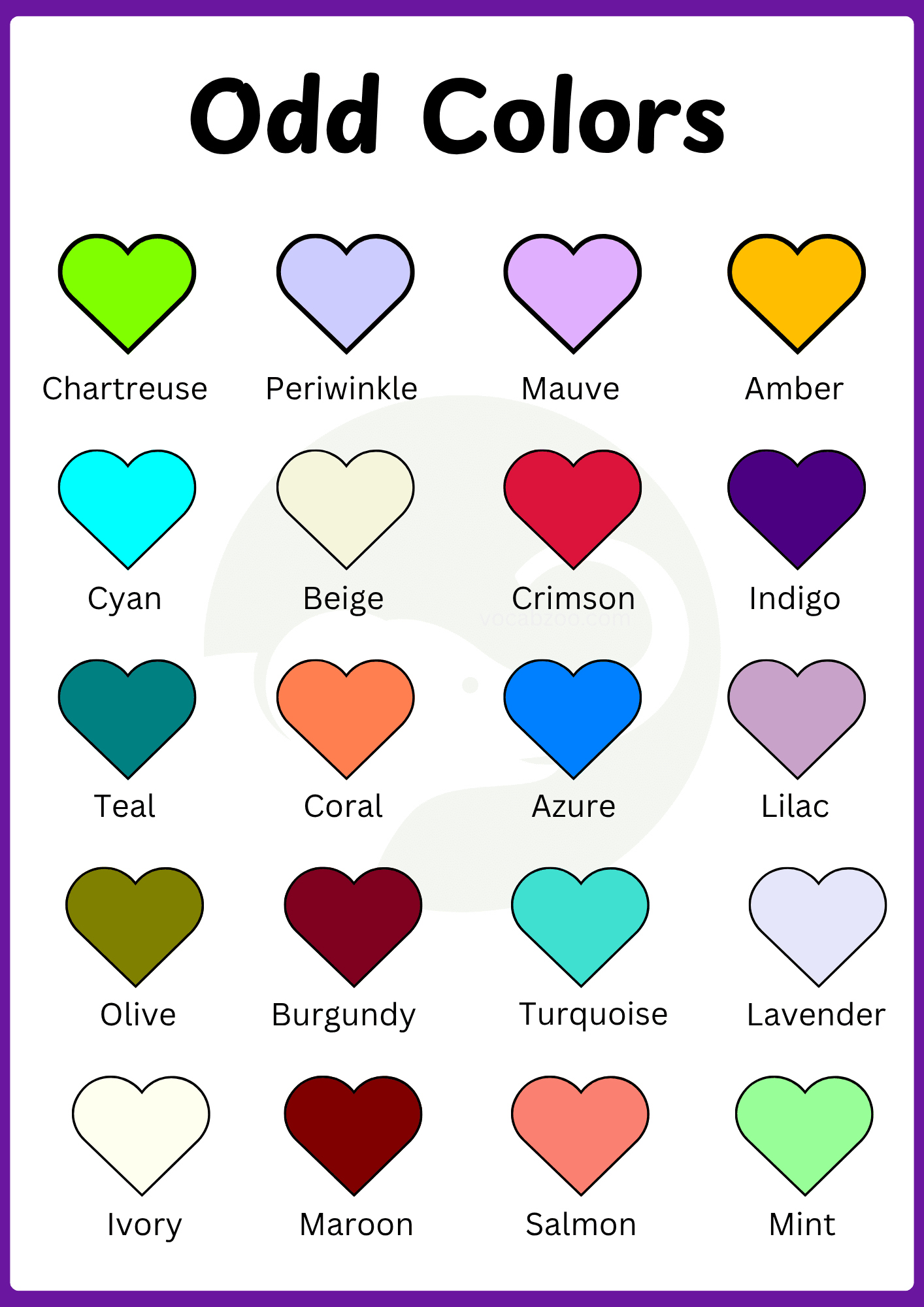 Odd color names are uncommon or unique names of colors that many people do not use in daily speech. They are not simple like red, blue, or green, but have special shades or meanings.