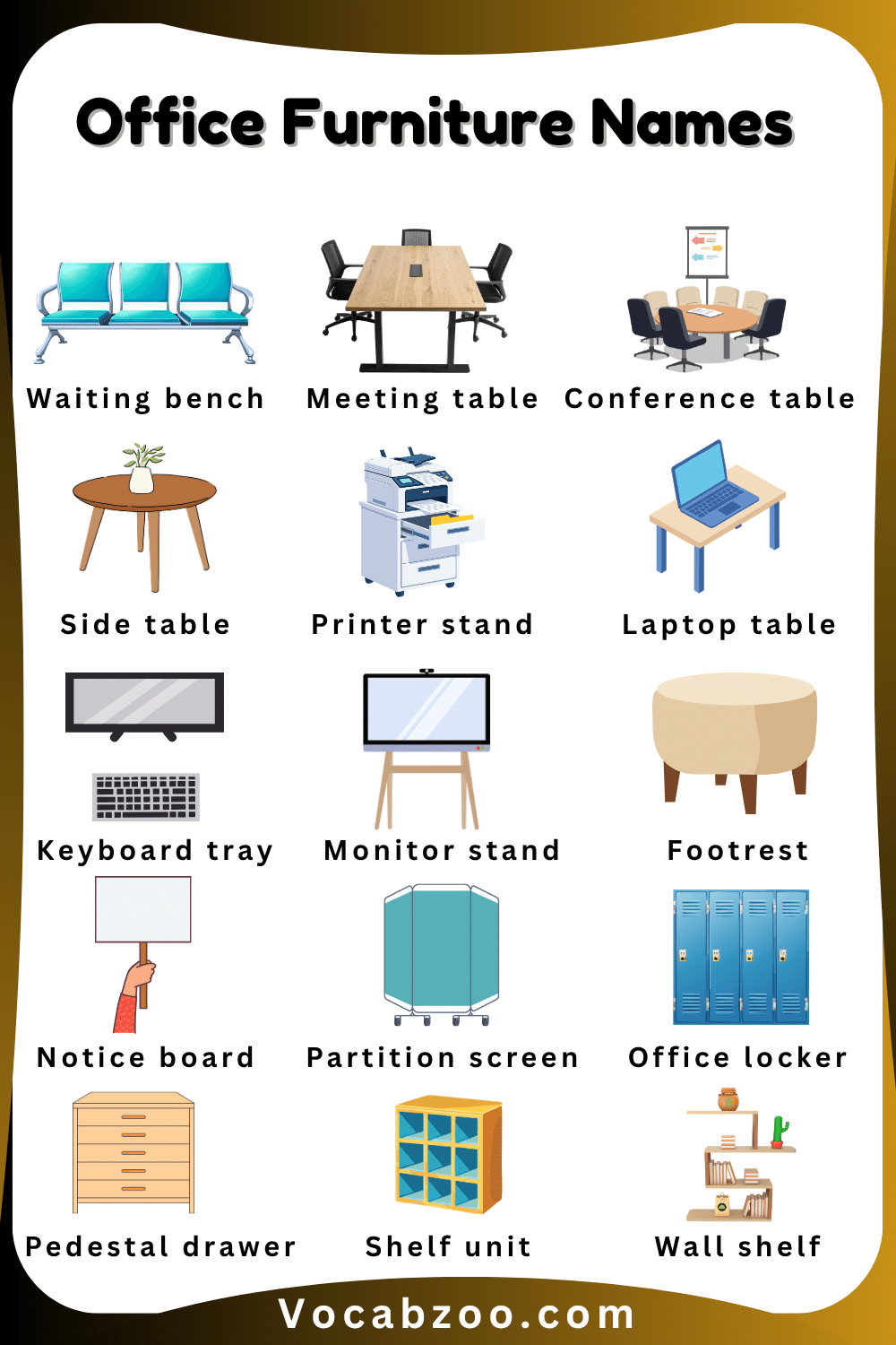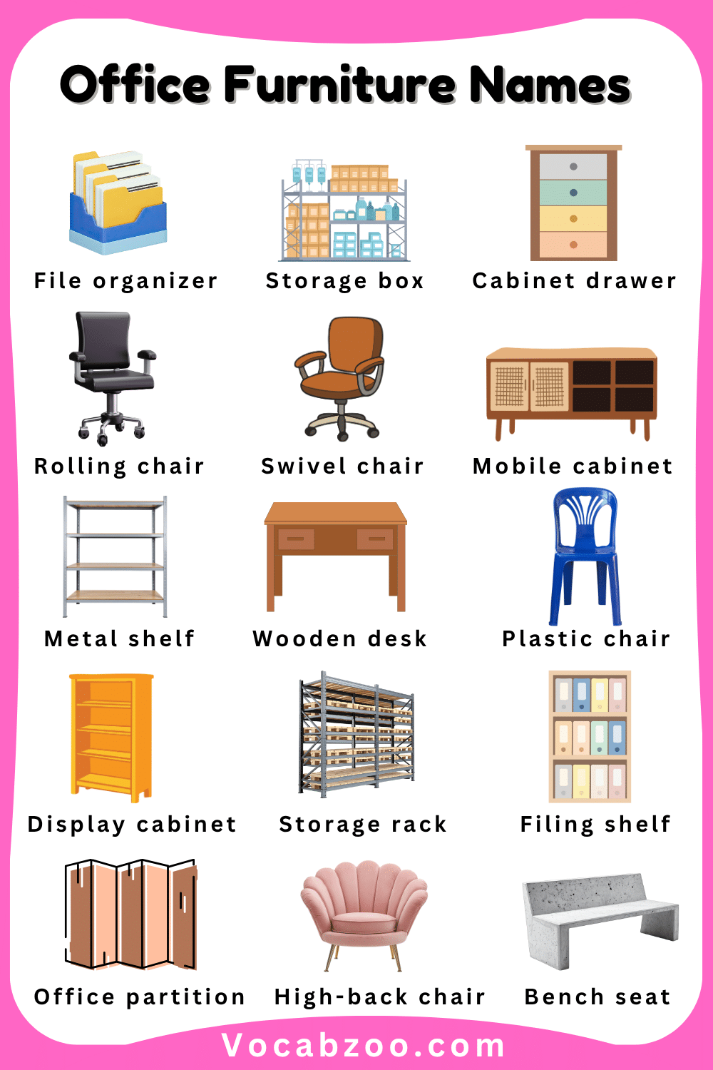 Office furniture includes the useful items and equipment that people use to work comfortably in an office or study area. Common pieces of office furniture include a desk, chair, bookshelf, cabinet, and table, which help keep the workspace organized and efficient. Learning office furniture names in English helps kids recognize everyday objects used in offices and study rooms while improving their vocabulary. In this article, children will learn office furniture names with their pictures, making it easier to identify these items and understand how they are used in a workplace or learning environment.