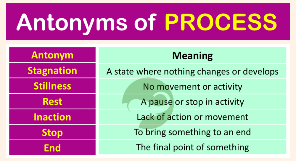 Here are some common opposites for “process” with meanings and examples in simple English. Each opposite word shows a different situation depending on the context.