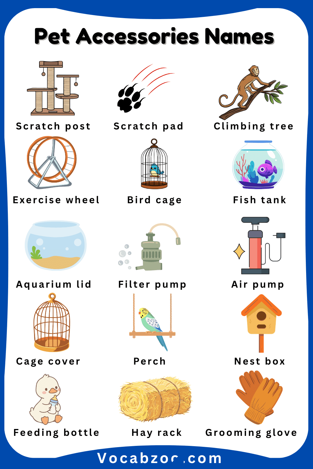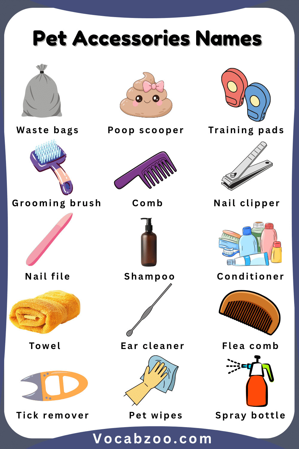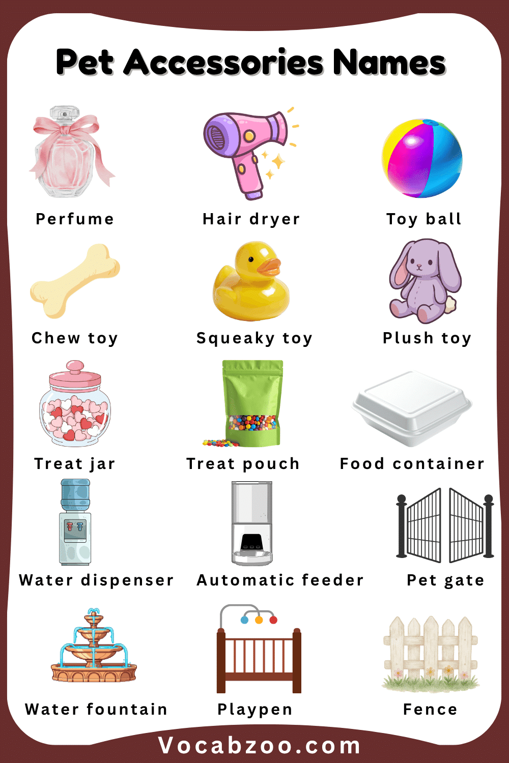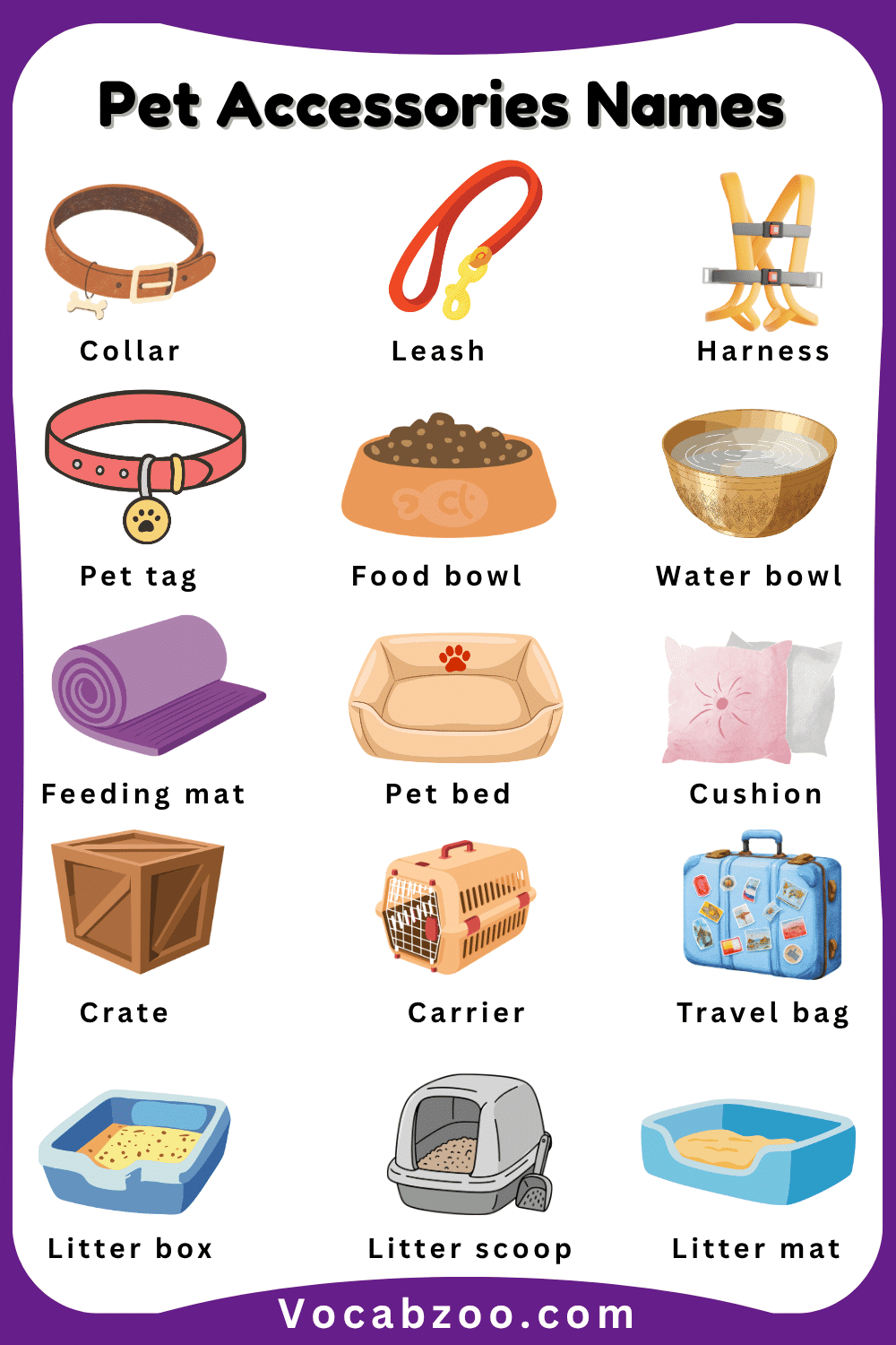 Pets are loving companions, and taking care of them becomes more fun when we use the right tools and items. In this topic “Pet Accessories Names for Kids in English with Pictures,” children will learn the names of different useful things that help in feeding, grooming, playing, and keeping pets safe and comfortable. Each accessory has its own purpose, such as keeping pets clean, healthy, and happy. With simple pictures and easy vocabulary, kids can quickly understand and remember these words. This learning will also help them build strong English vocabulary while understanding how to care for animals in a responsible and friendly way.