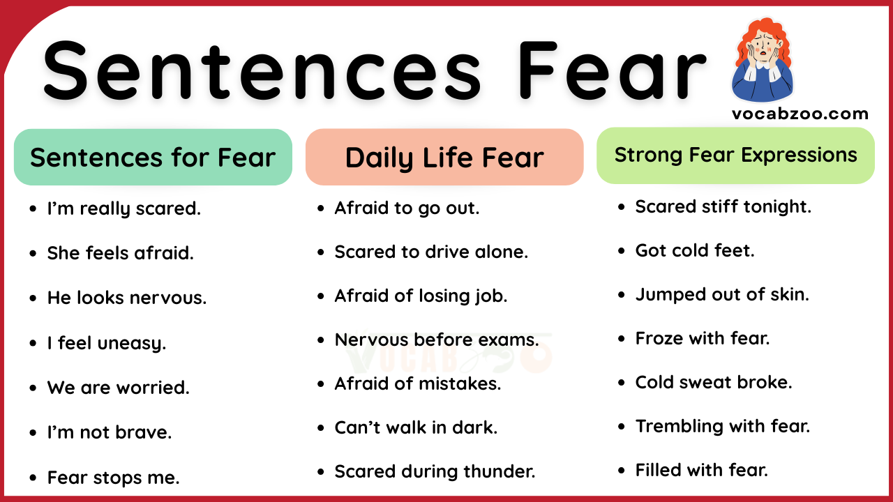 Fear is a natural feeling that everyone experiences. In this lesson, you will learn sentences for fear, daily phrases, idioms, and examples to express fear in simple English. These will help you speak more confidently in real conversations. When you learn these sentences, it becomes easier to share your fear. They also help you talk about sad or hard situations in simple English.