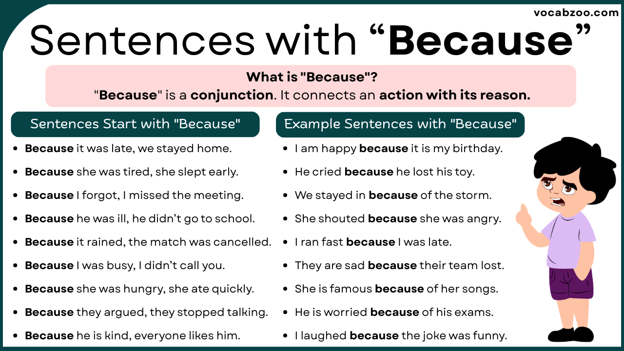 The word “because” is very important in English. We use it to show reason or cause for something. In this article, you will learn the use of “because” in sentences, its meaning, and simple examples for clear understanding.