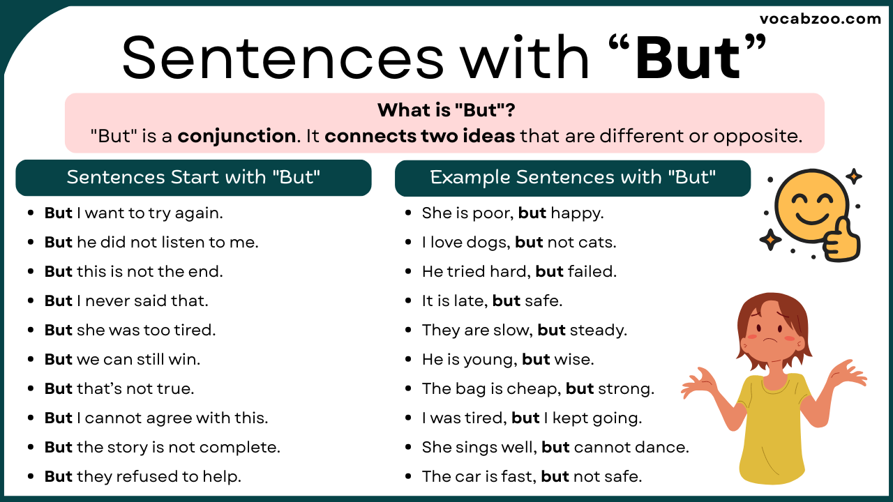 The word “but” is small, yet it is very powerful in English. We use it to show contrast, difference, or exception. In this article, you will learn the use of “but” in sentences, its meaning, and easy examples.