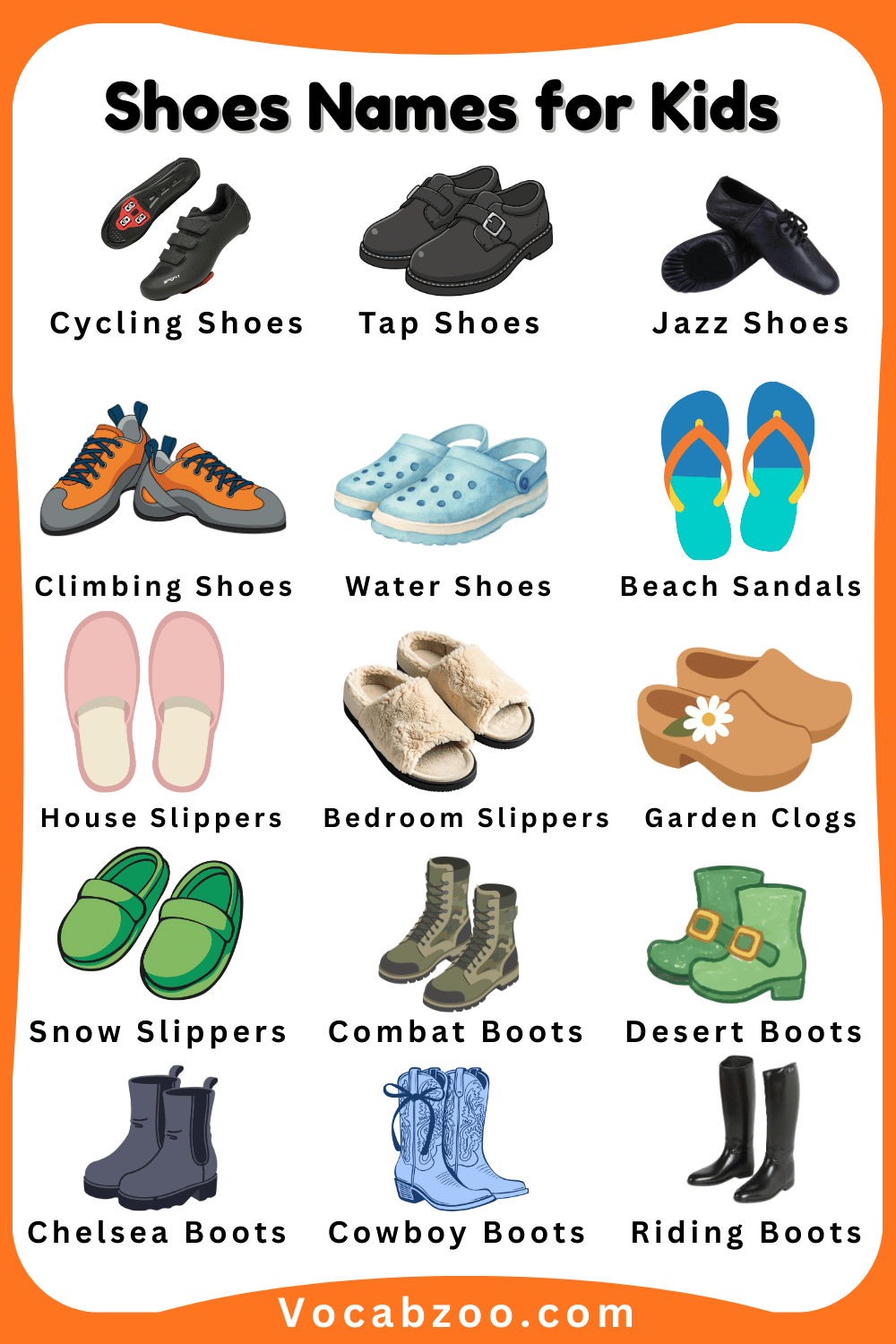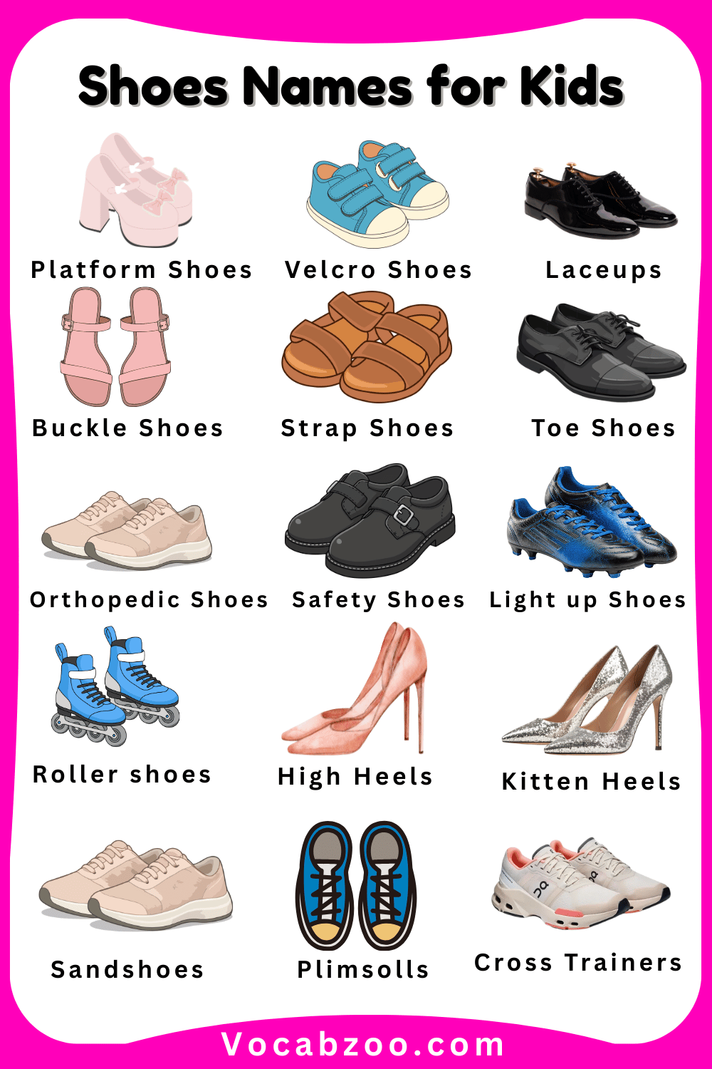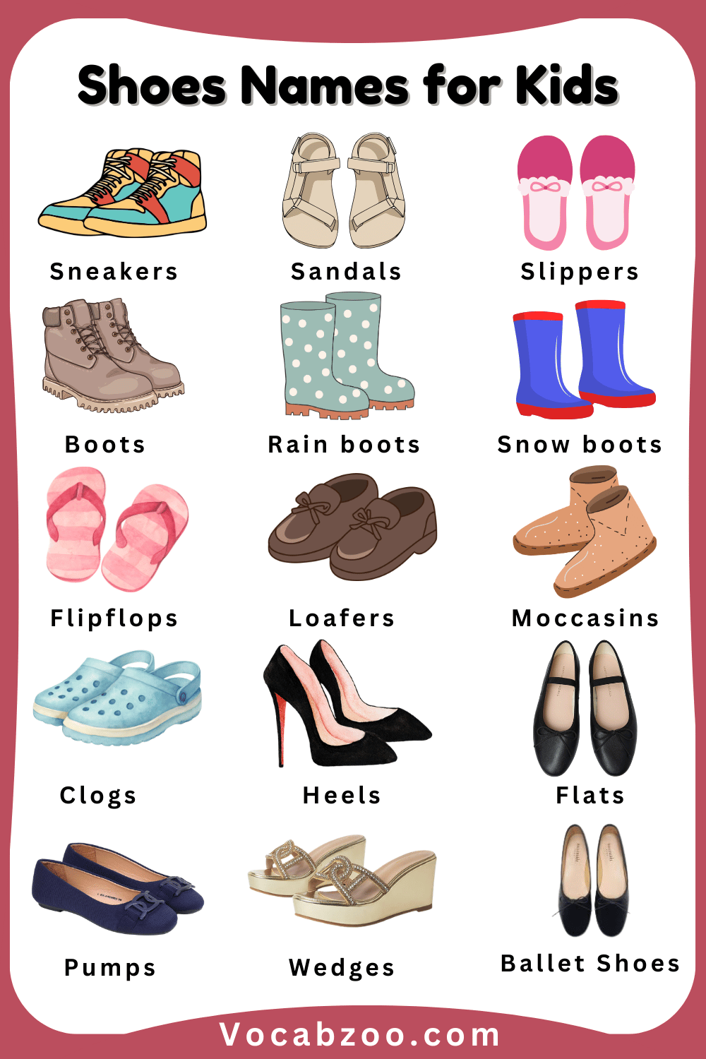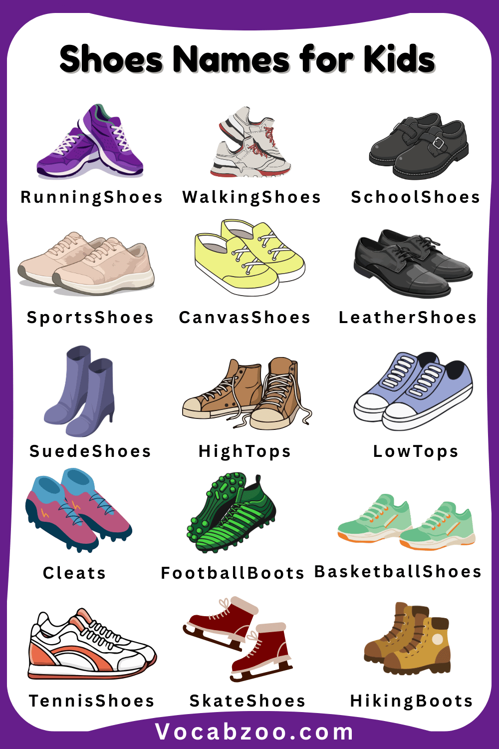 Shoes are an important part of our daily clothing because they protect our feet and help us walk, run, and play comfortably. There are many different types of shoes, and each one is designed for a special purpose, such as school, sports, or special occasions. Learning Shoes Names for Kids in English with Pictures helps kids recognize different kinds of shoes and understand when to wear them. When children see pictures along with the names, it becomes easier for them to remember and identify each type. In this article, kids will learn some common shoes names in English with pictures in a simple and fun way.