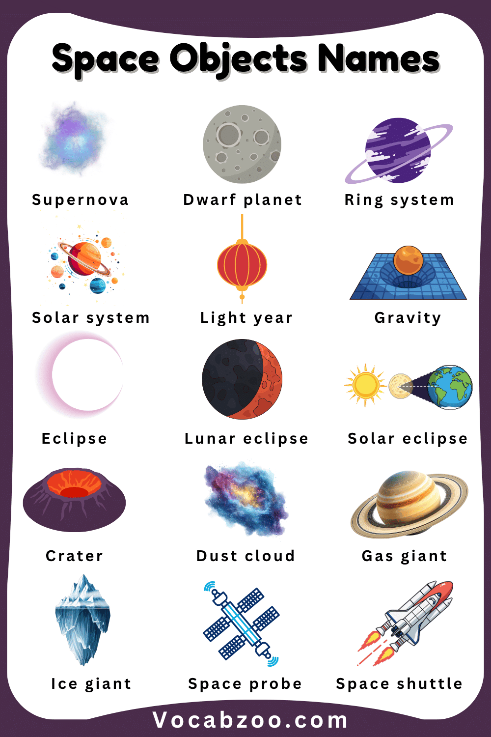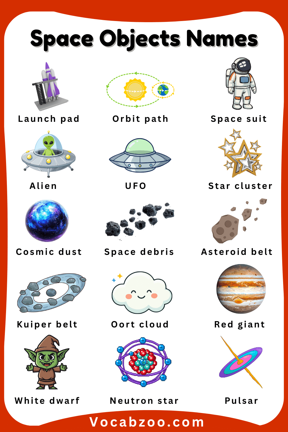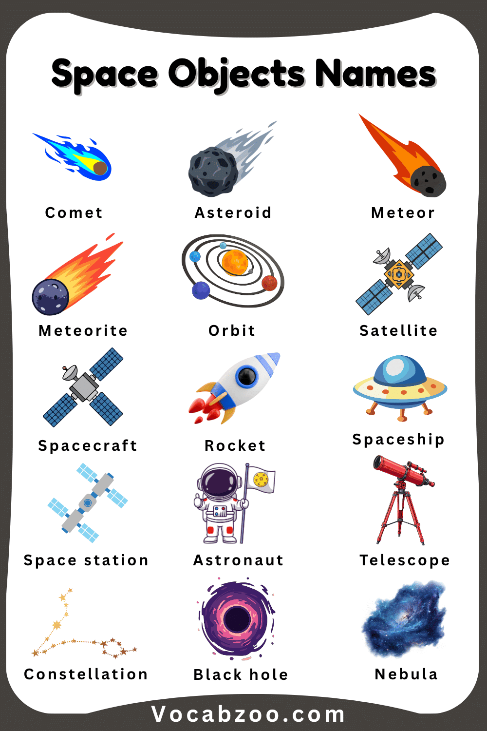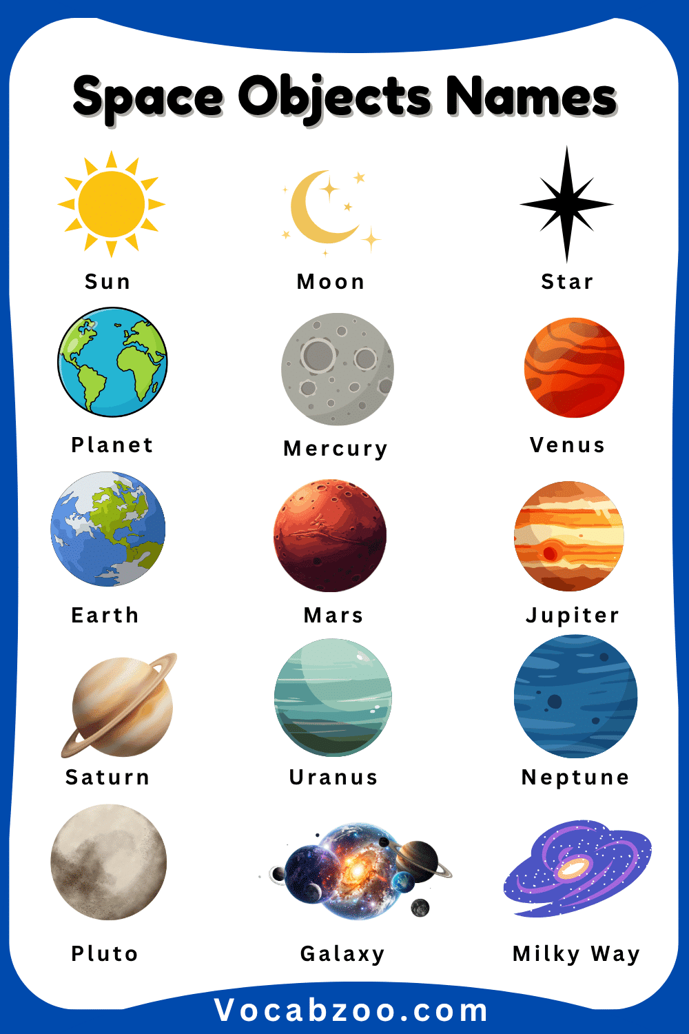 Space is a vast and fascinating place filled with many amazing objects such as planets, stars, moons, asteroids, and comets. These objects make up the universe and help scientists learn more about how the solar system and galaxies work. Learning space object names in English helps kids and beginners understand basic astronomy and discover interesting things about the universe. In this article, children will learn different Space Objects Names for Kids and pictures, making it easier to recognize these objects and learn about the wonders of space.