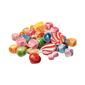Candy is a sweet treat made from sugar and flavors. It comes in many shapes and colors and is enjoyed by children as a small snack.