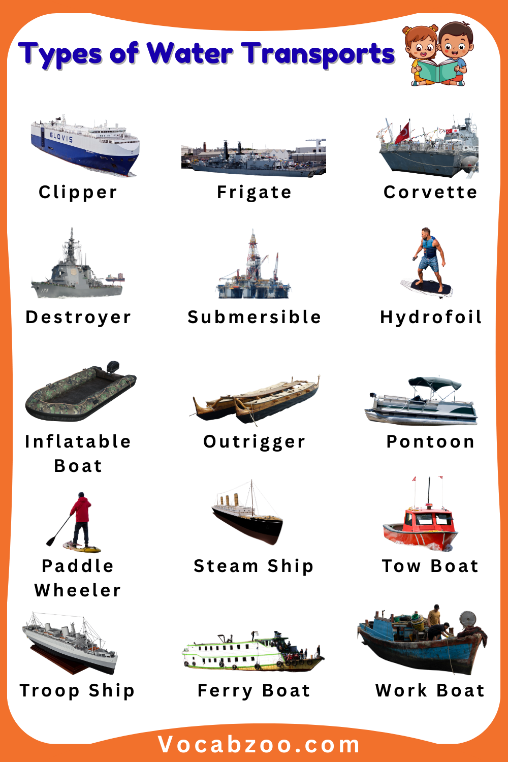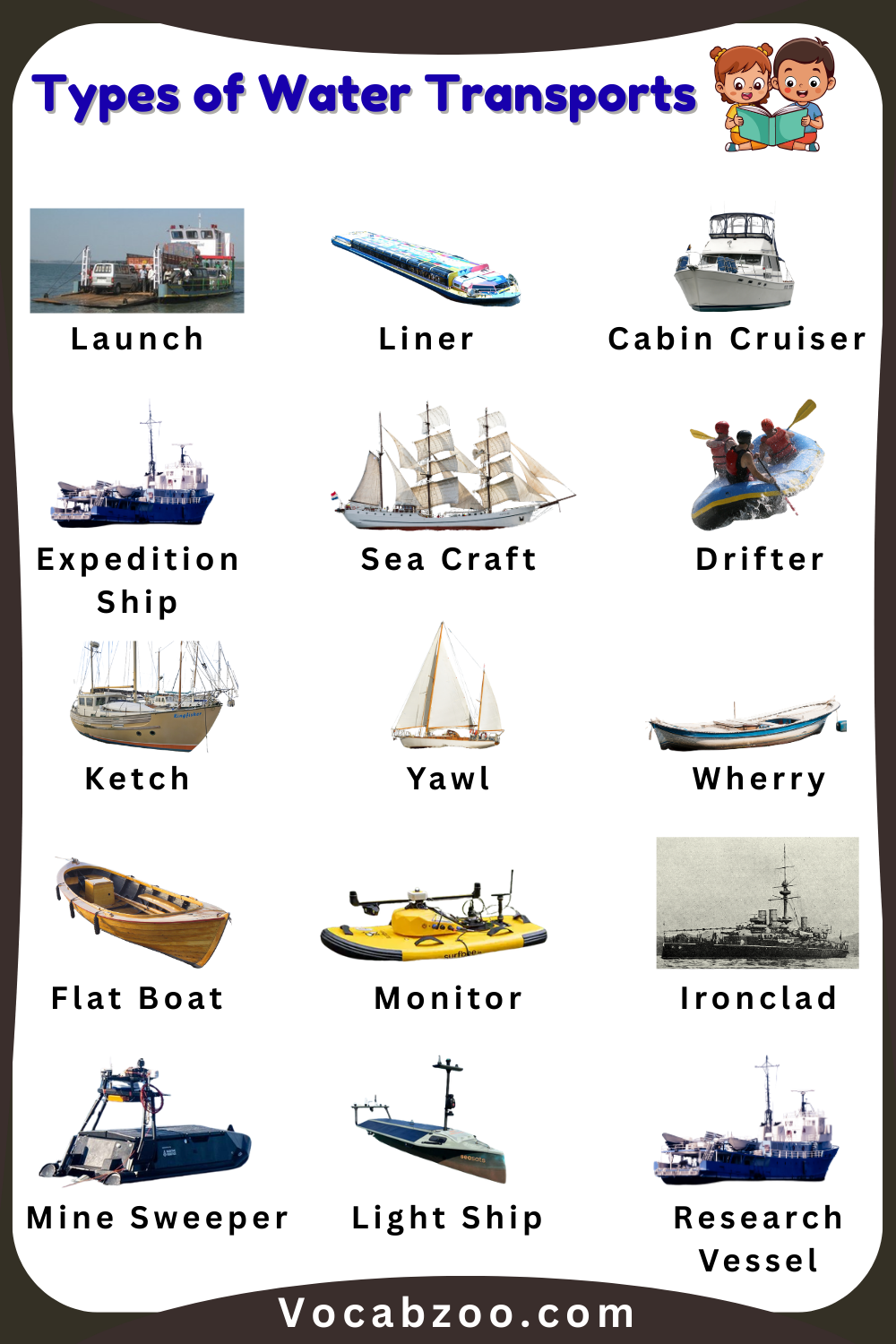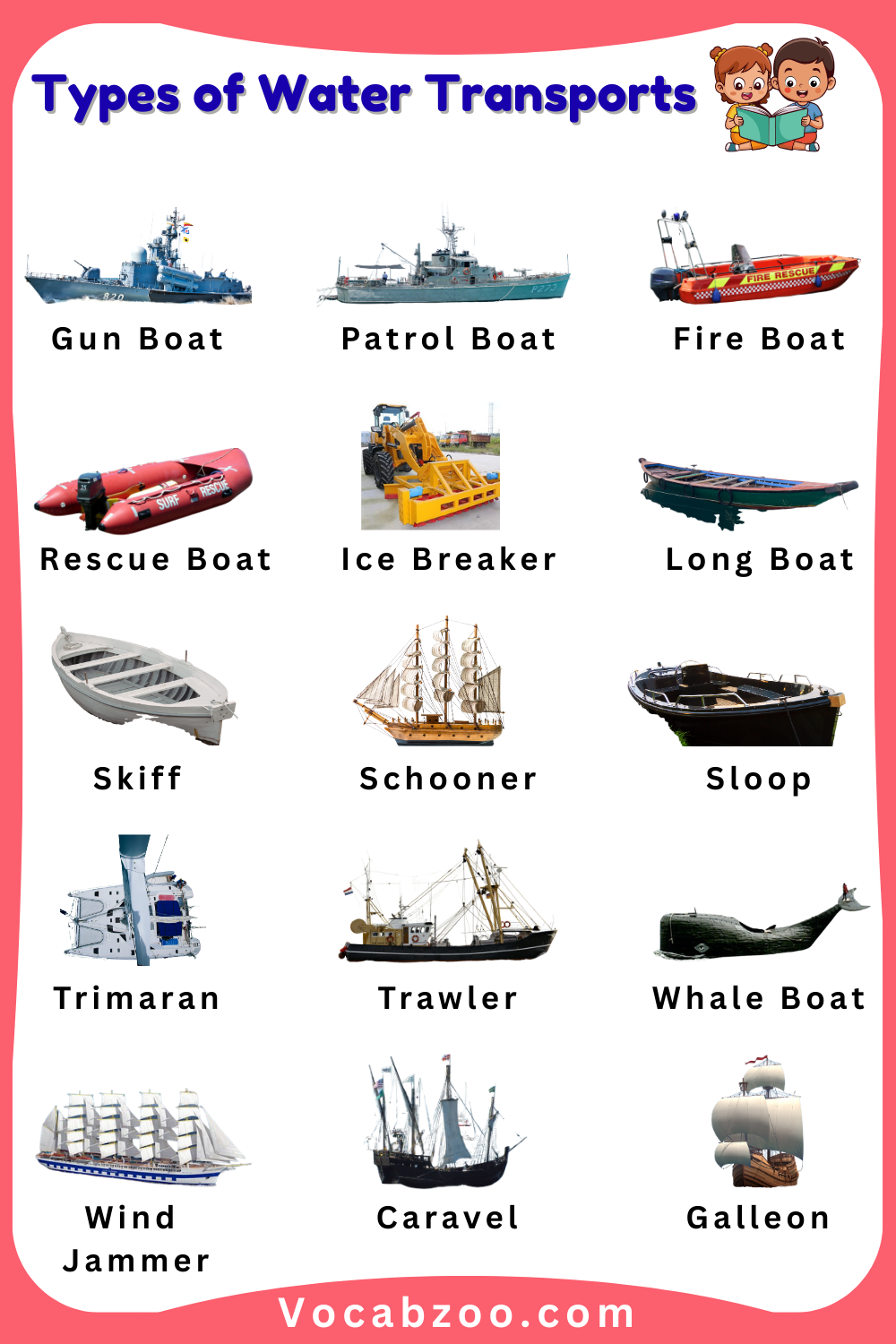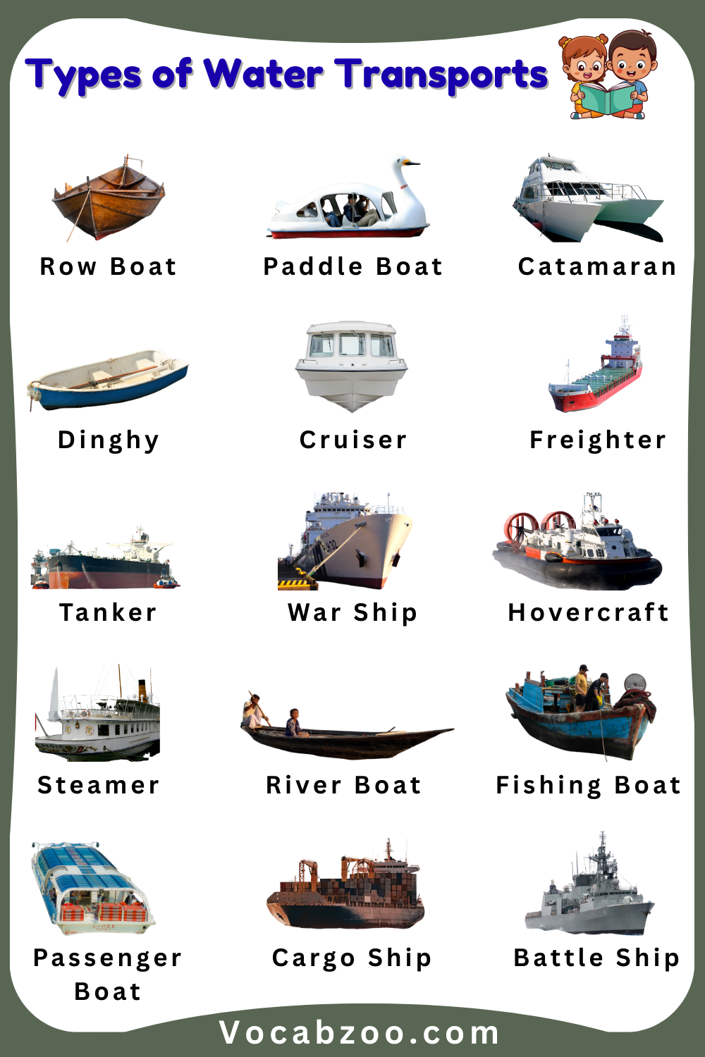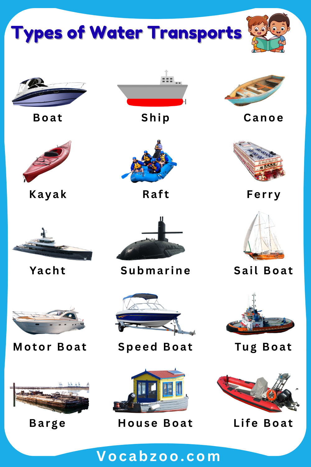 Water is one of the most important ways people travel and move goods around the world. From ancient times to today’s modern world, humans have used rivers, lakes, and oceans to explore new places and connect with others. That’s why learning Water Transports Names for Kids is both fun and educational. When children understand the different types of water transport, they not only improve their vocabulary but also gain knowledge about how the world works. In this article, we will learn Water Transports Names for Kids in simple and easy English, so young learners can read, understand, and remember them easily.