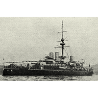A heavily armored warship equipped with large guns and weapons for naval warfare.
