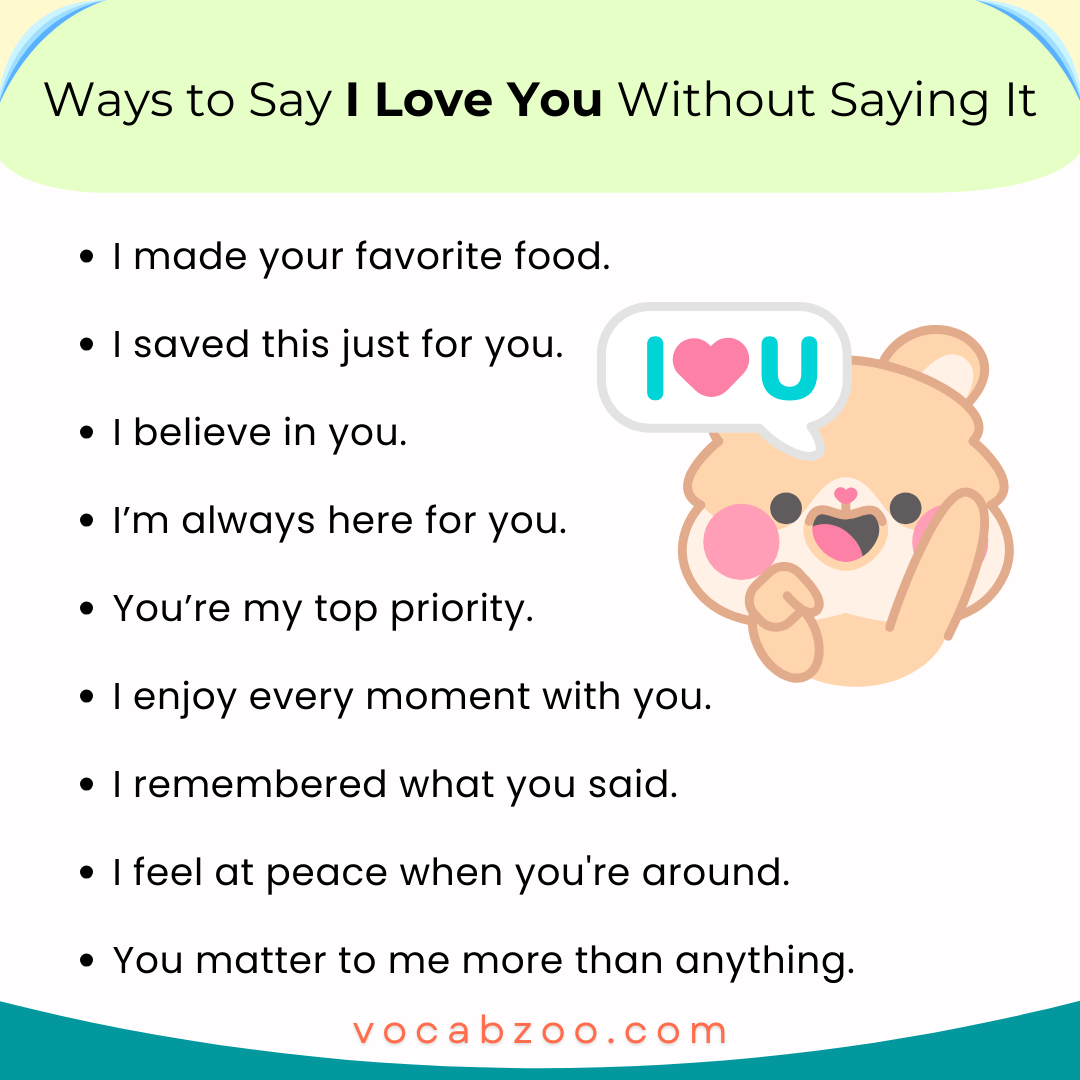Try alternatives like: “You mean everything to me,” or “I care about you deeply.” These show love without the exact words.