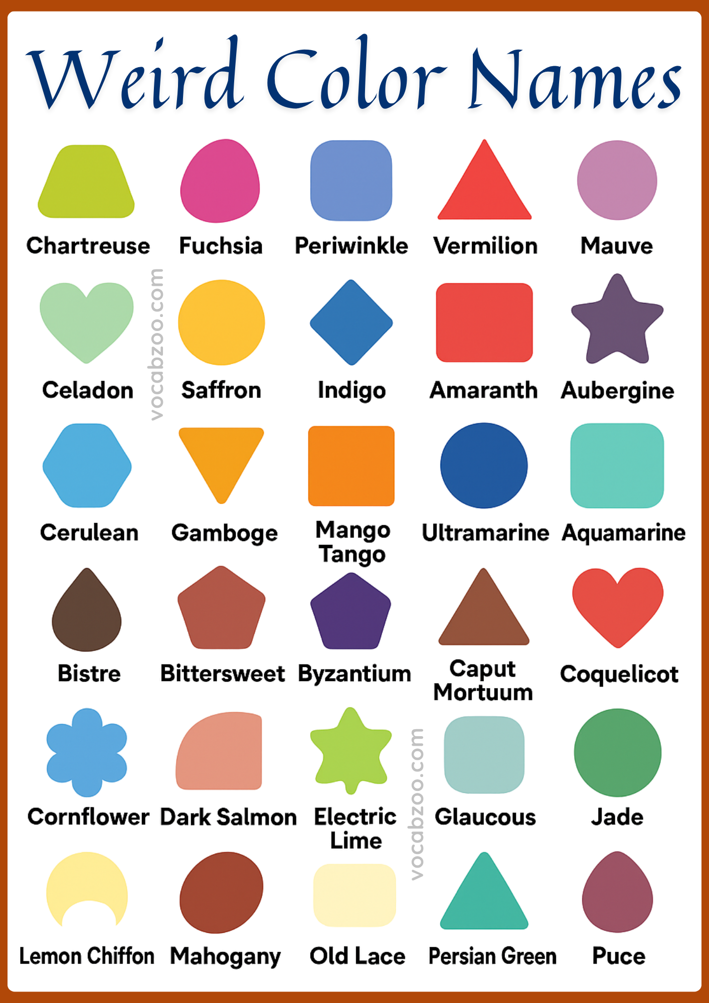 Some color names are funny or unique because they come from nature, food, or objects. They are not commonly used in everyday English.