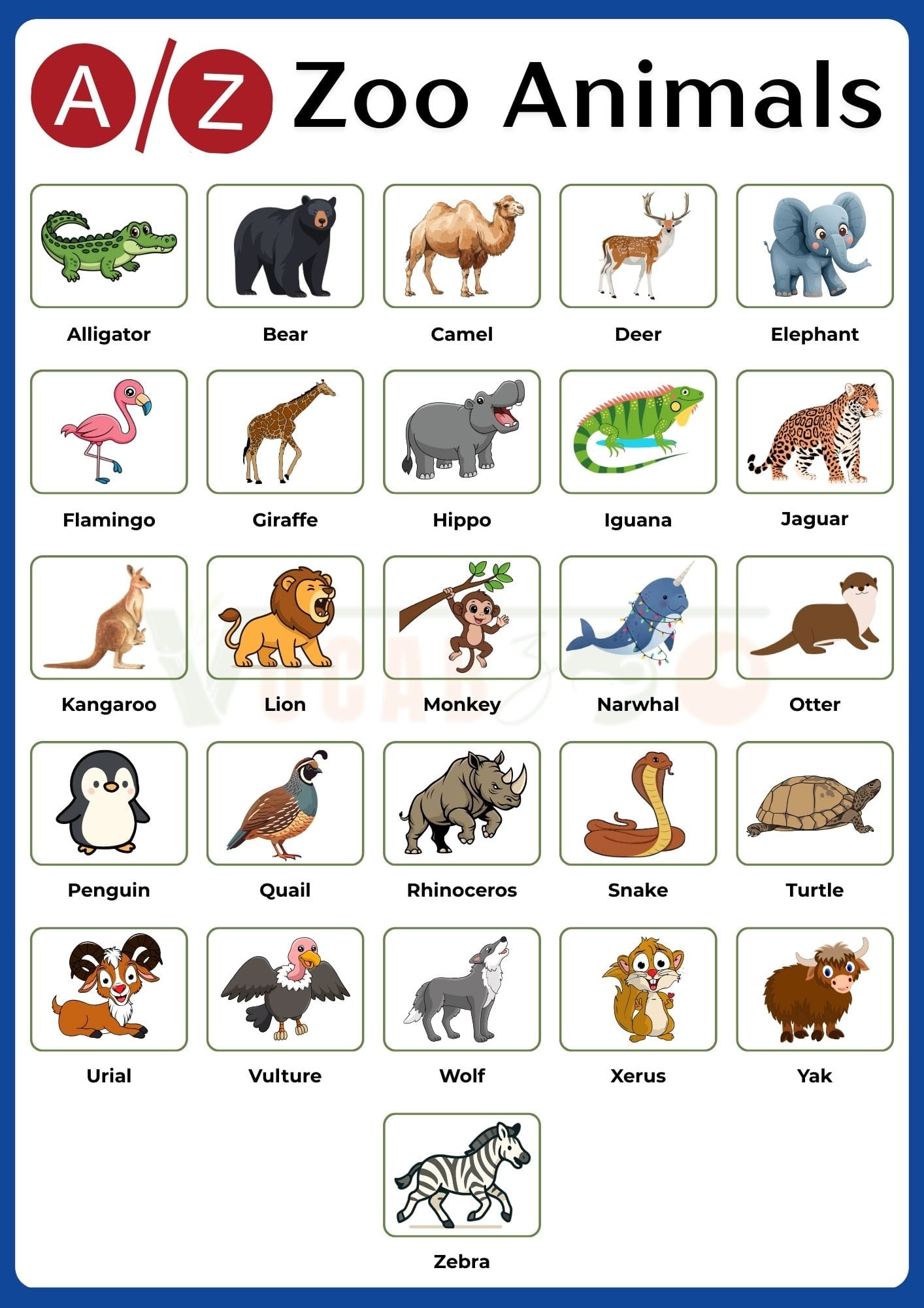Zoo animals are wild animals that live in a protected place where people can learn about them. They include mammals, birds, reptiles, amphibians, and fish, such as lions, elephants, penguins, snakes, and frogs.